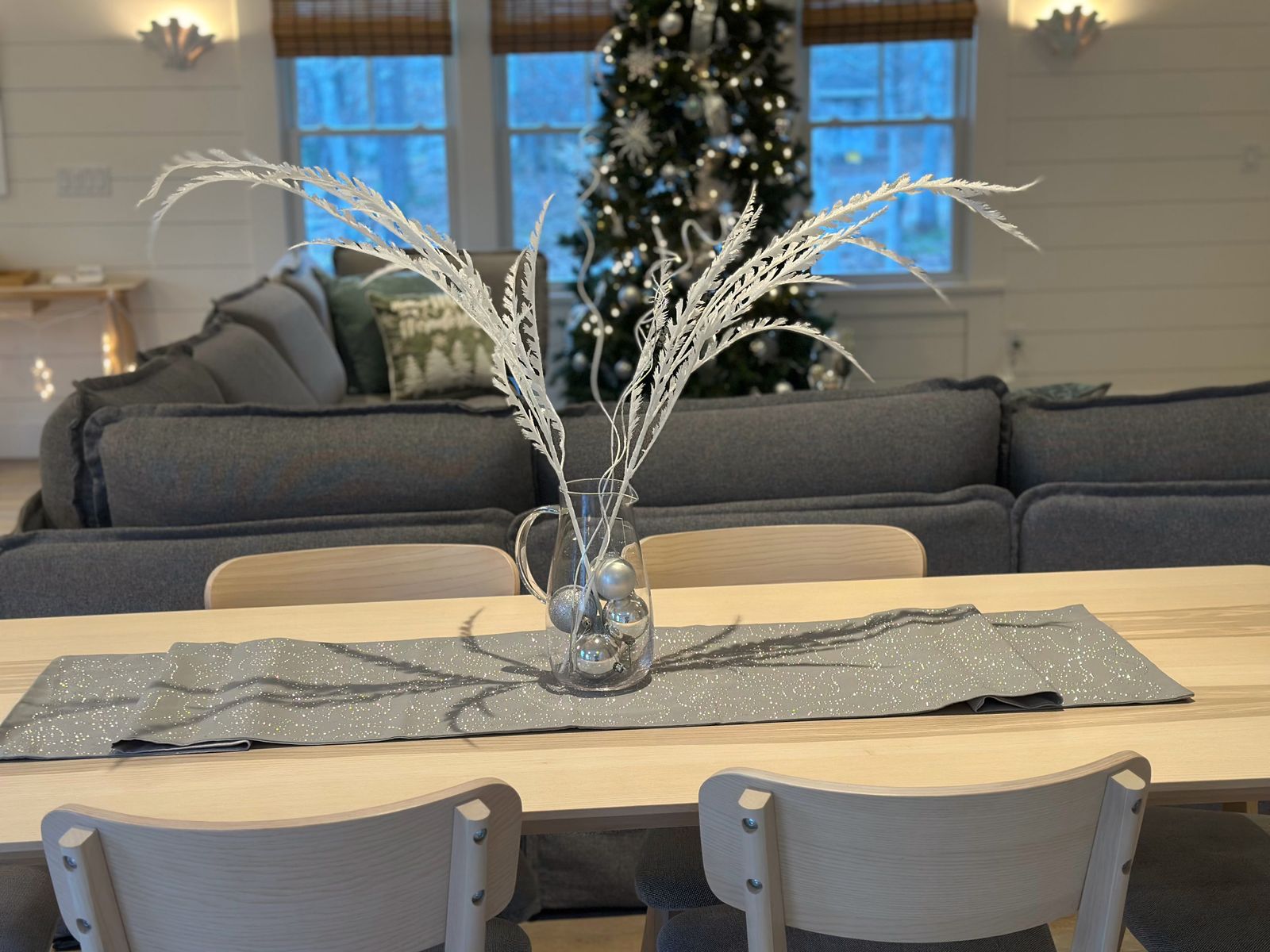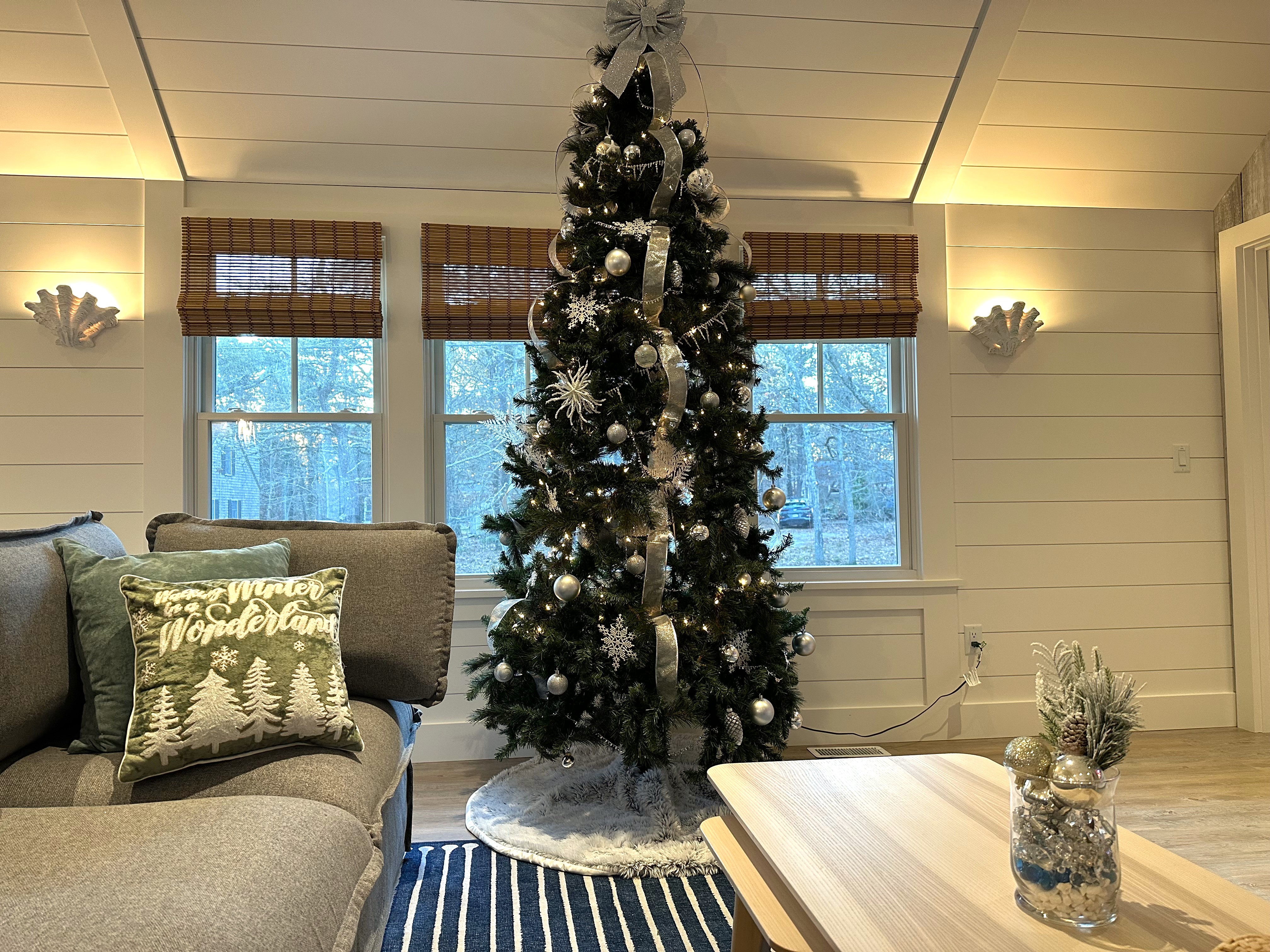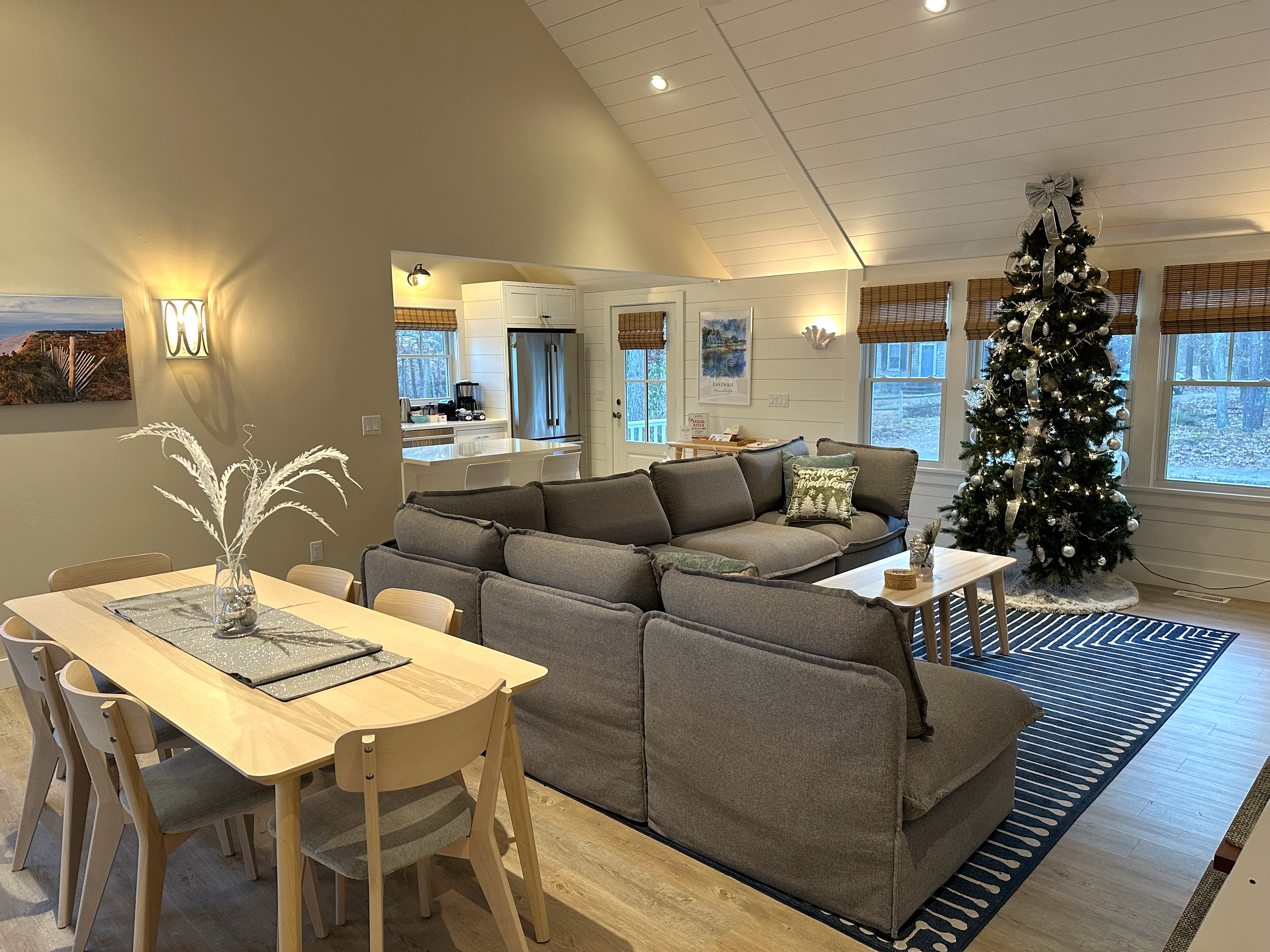 The living room is made for sweater weather lounging—settle into the plush sofa, cue up a cozy movie on the theater-sized smart TV, and let the surround sound pull you in. Upstairs, a loft TV nook and those beanbag-turned-beds create the perfect hideaway for kids or a lazy afternoon nap after a long beach walk.