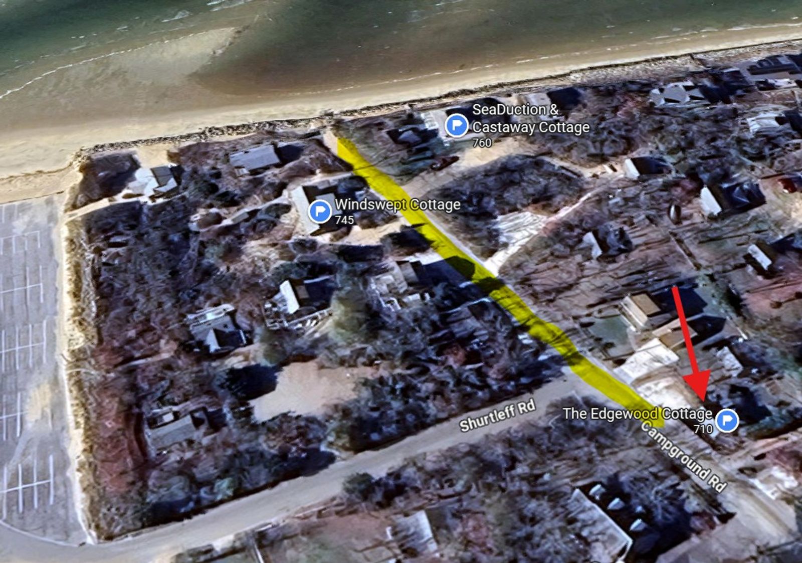 Campground Road dead ends into the stairs to the beach. This area of the beach is private for the homeowners and guests that live/are staying in the neighborhood. Our neighborhood is made up of quiet little homes and cottages leading to the stairs to the beach