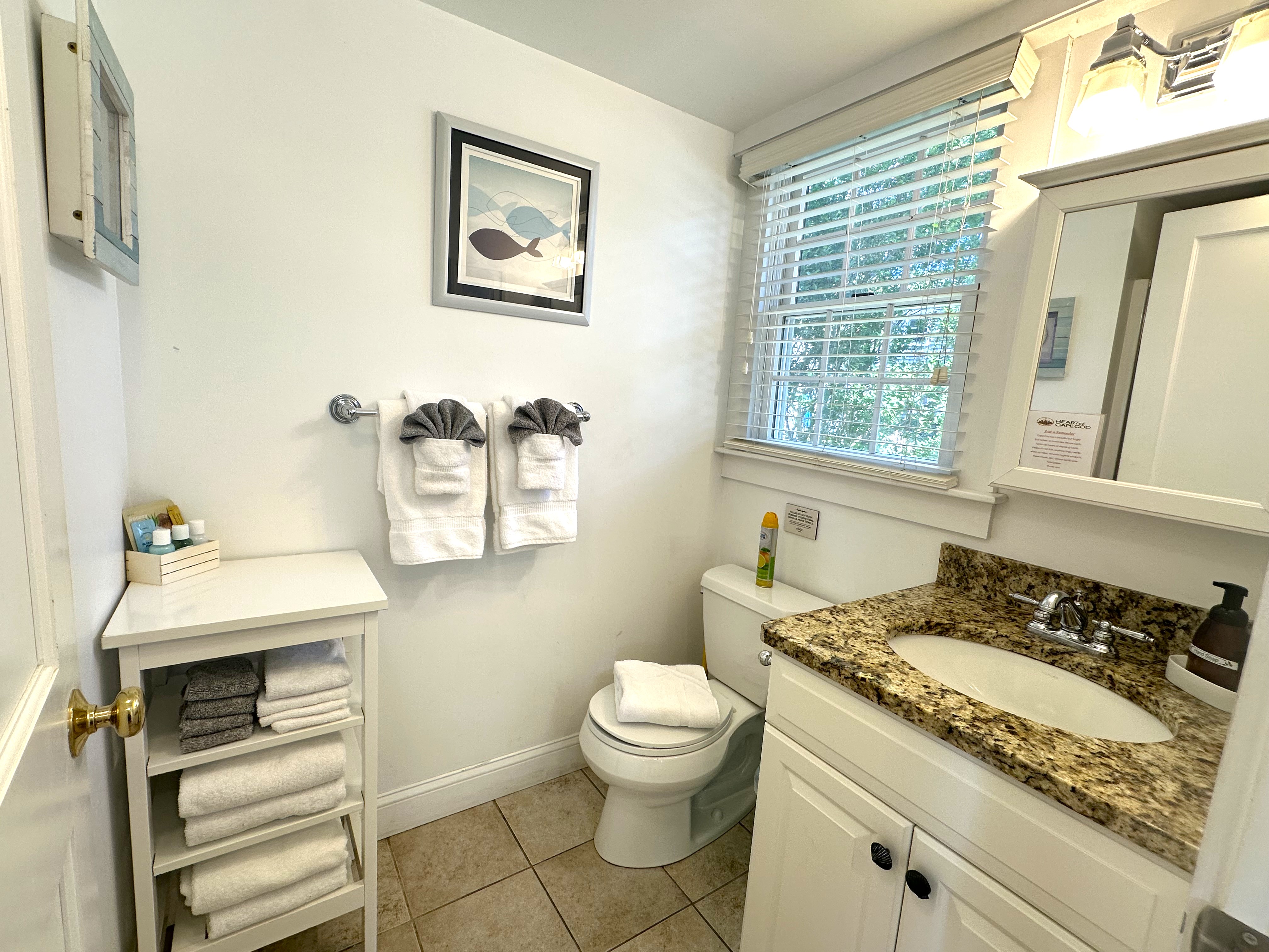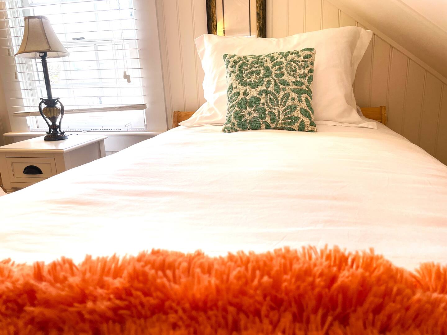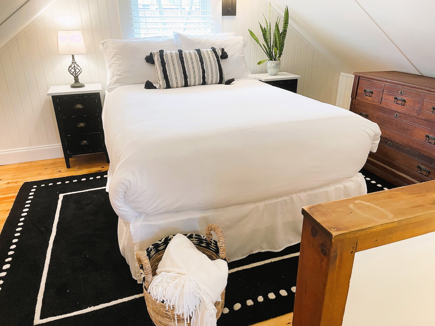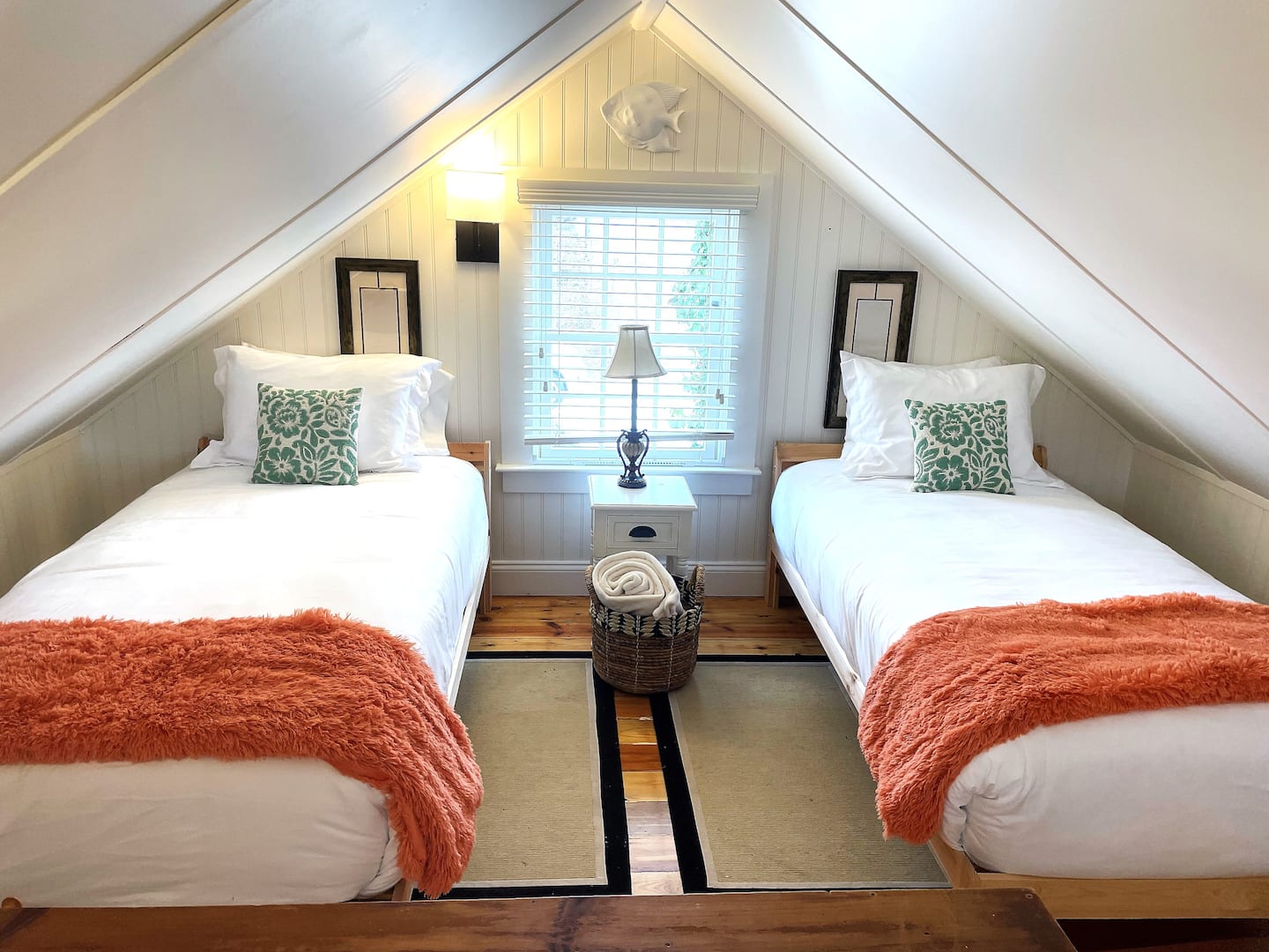 Our 420 square foot cottage is nicely laid out with a master bedroom, bathroom, living room and kitchen on the first floor and an open living space upstairs which houses the additional sleeping area. The master bedroom has a new queen mattress outfitted with soft linens, duvet, and a closet and bureau with plenty of room for storage. Upstairs you will find two comfortable twins on one side of the stairs and a beautiful full sized bed on the other. Two full size dressers keep your clothes stored nicely away along with your other treasures.