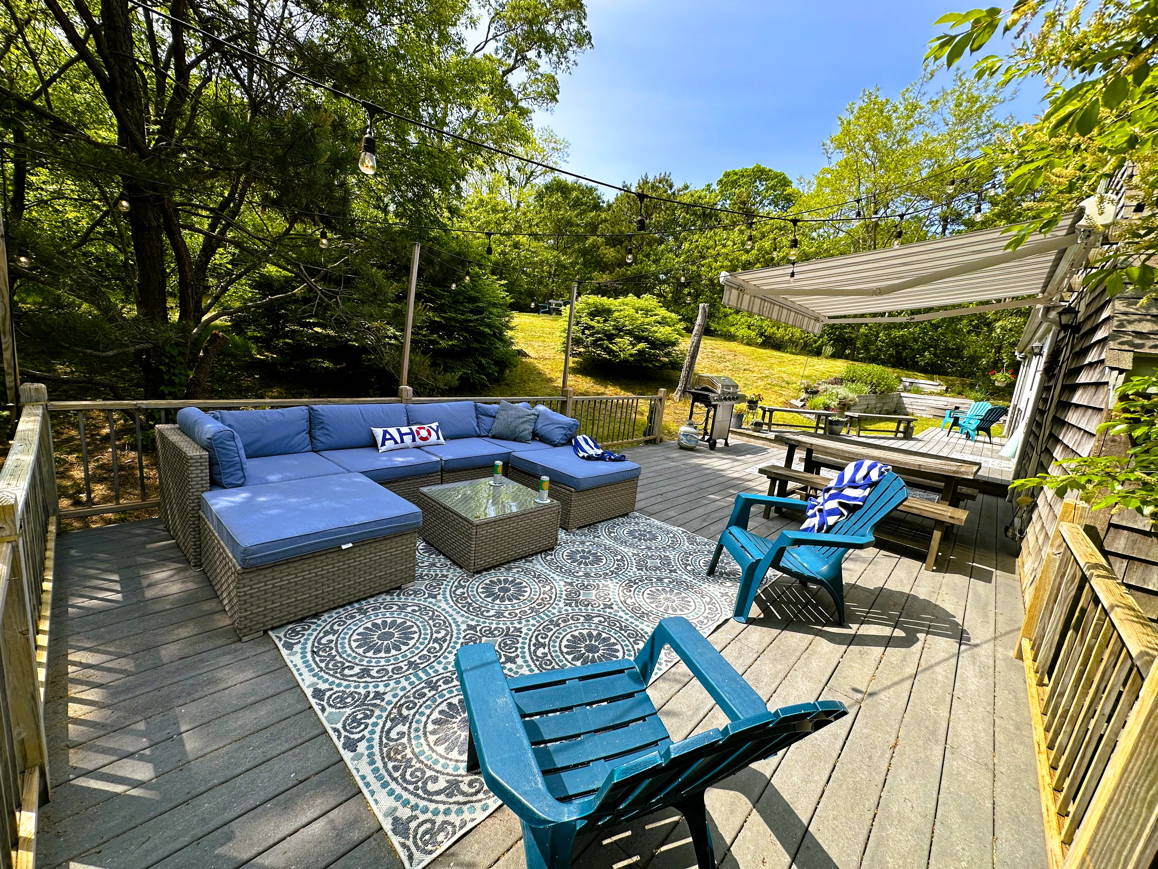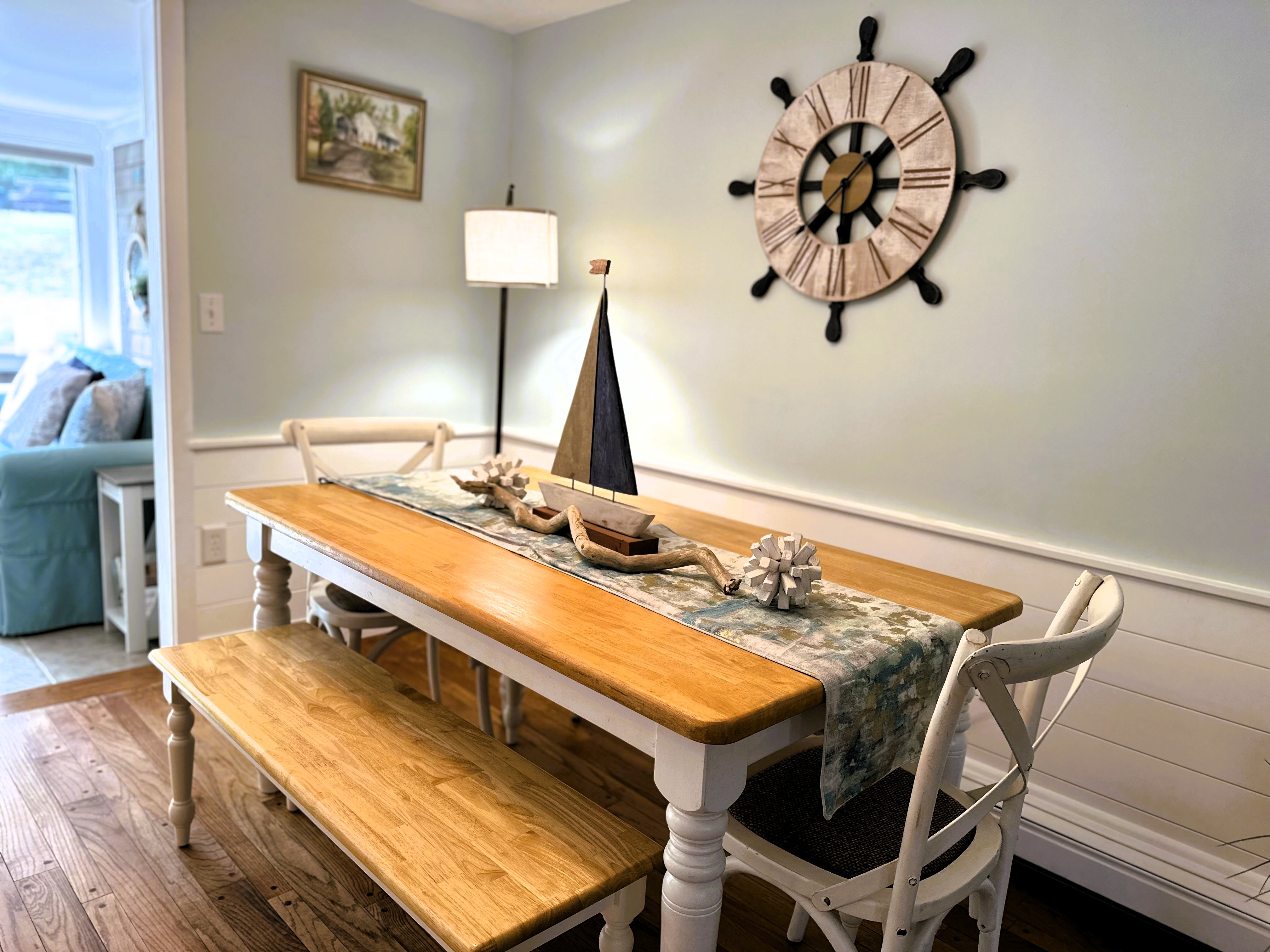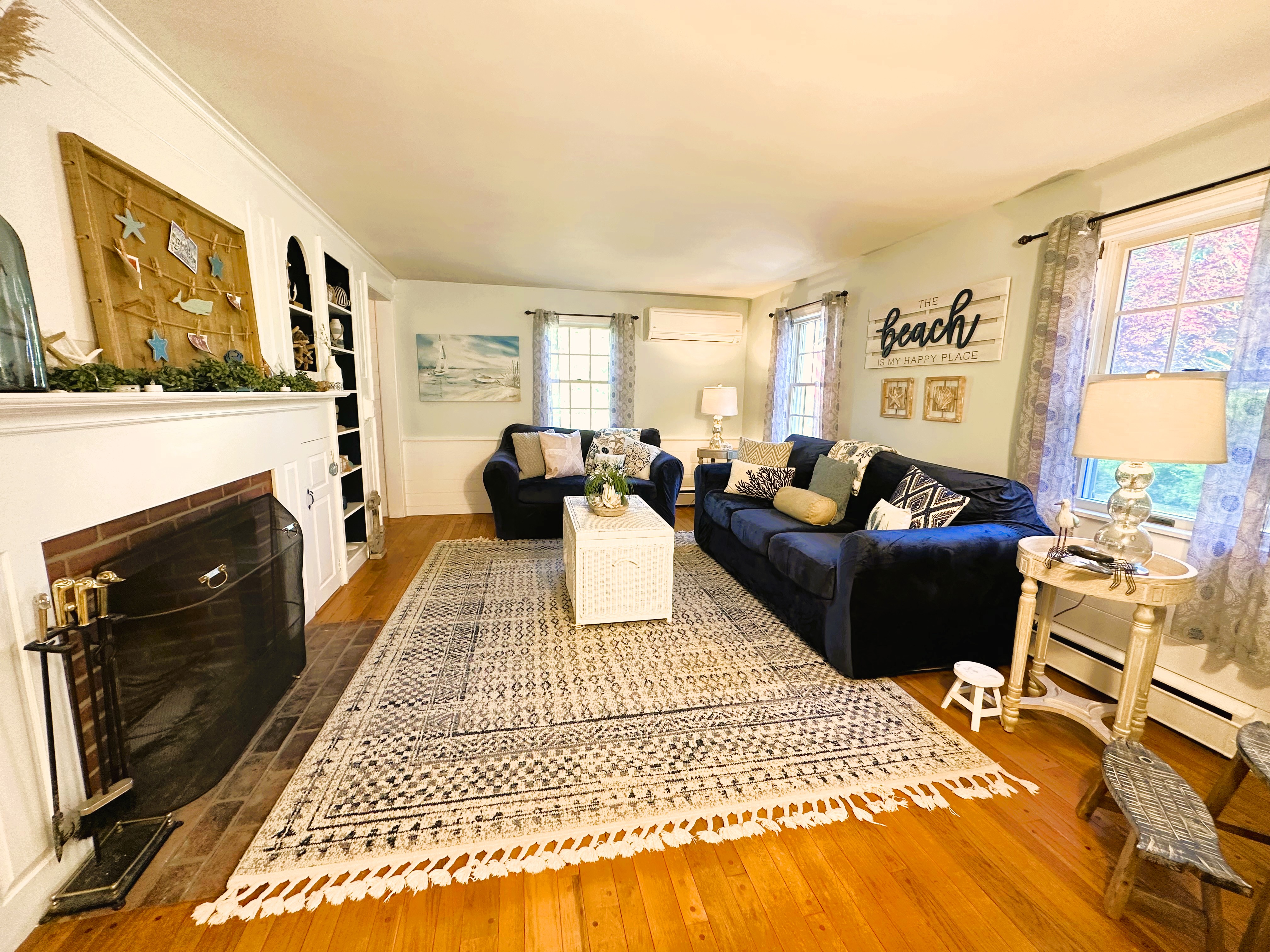 Outside, the deck becomes a haven for crisp evenings under twinkling string lights. Grill up local seafood, sip hot cider and eat s’mores by the fire pit, or enjoy the rustle of leaves as the sea breeze drifts through. The spacious yard invites impromptu games and laughter, while the garage is stocked with bikes for scenic rides along the Rail Trail and a canoe for exploring the calm nearby waters dressed in autumn color.