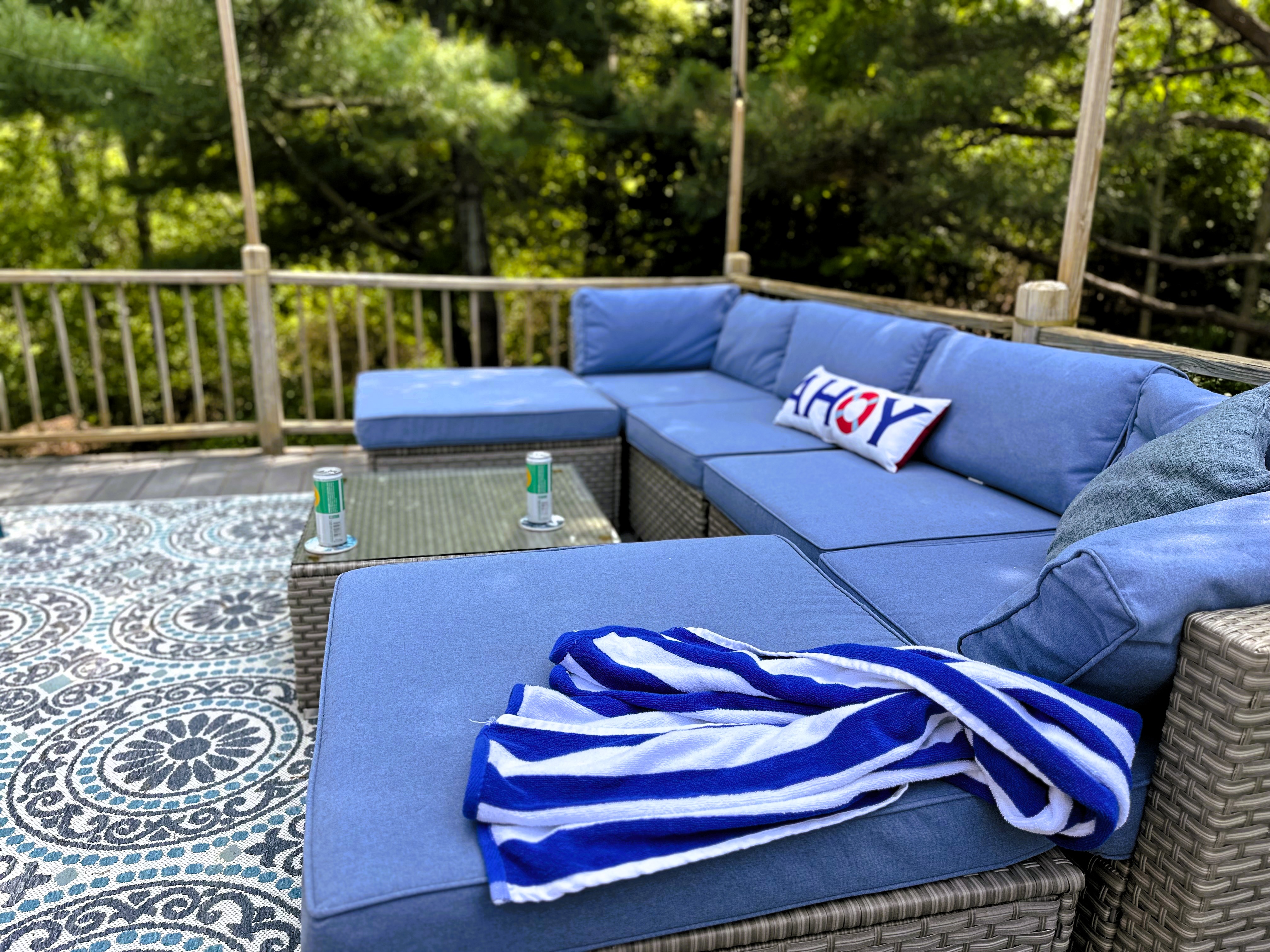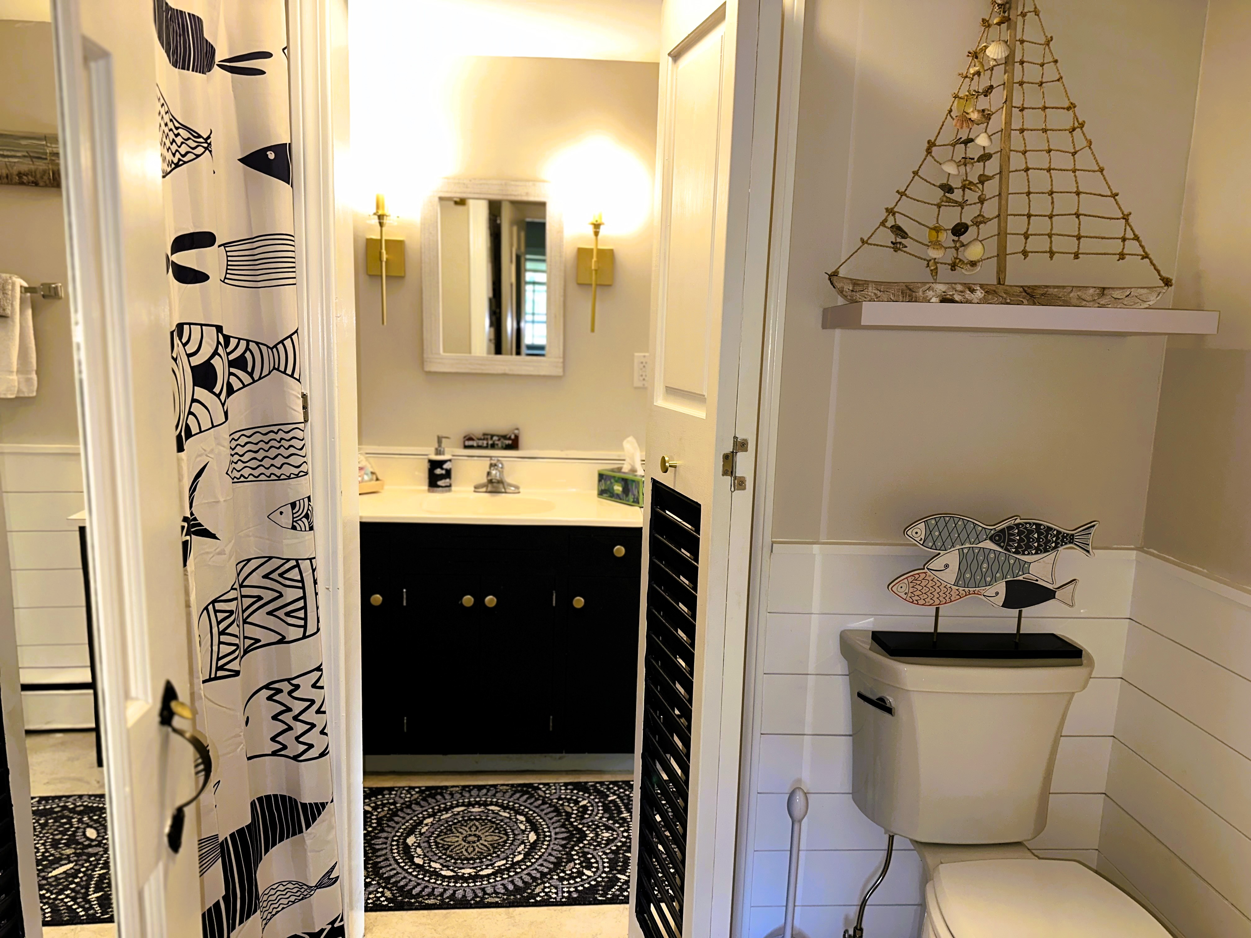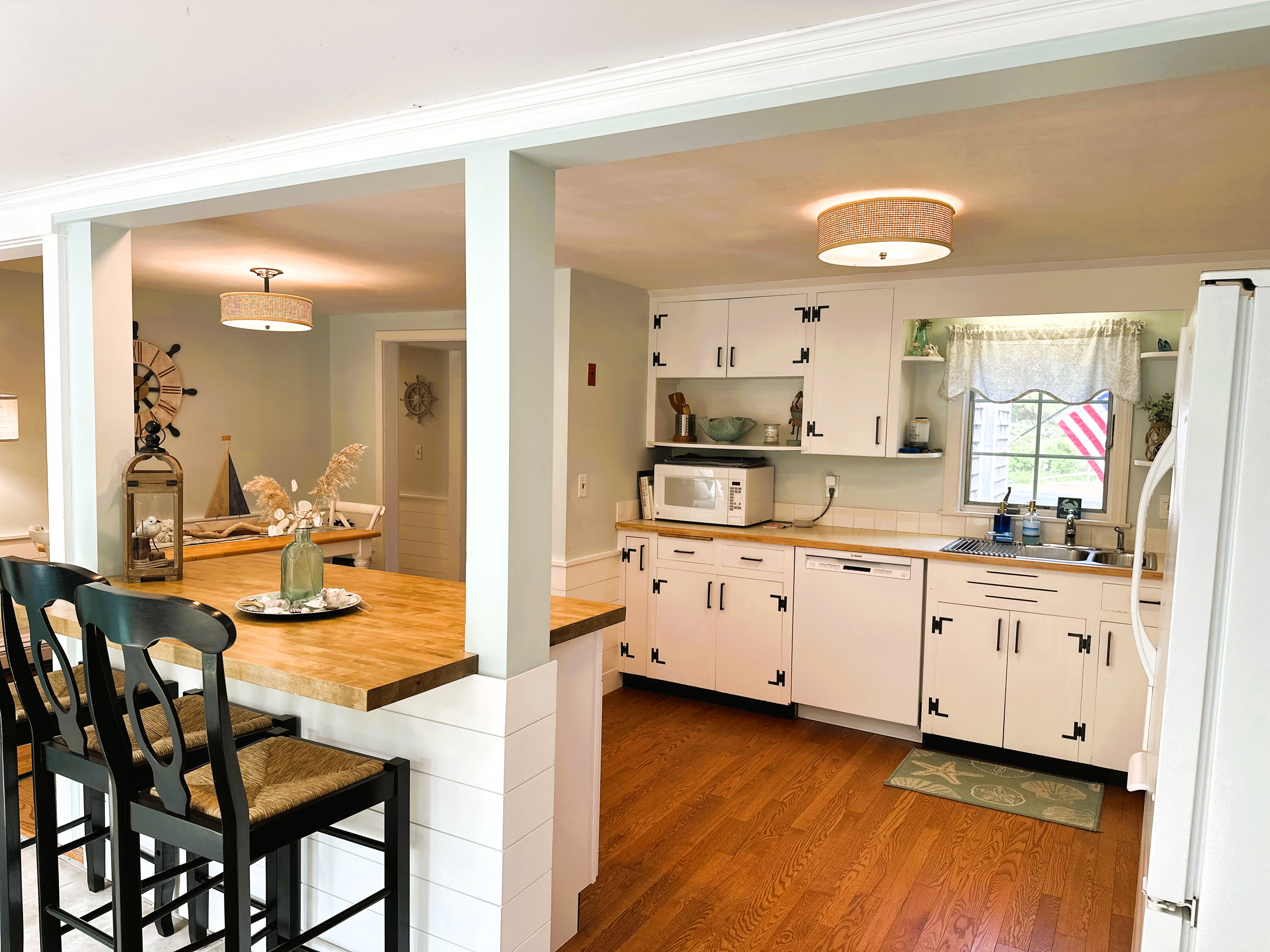 Outside, the deck becomes a haven for crisp evenings under twinkling string lights. Grill up local seafood, sip hot cider and eat s’mores by the fire pit, or enjoy the rustle of leaves as the sea breeze drifts through. The spacious yard invites impromptu games and laughter, while the garage is stocked with bikes for scenic rides along the Rail Trail and a canoe for exploring the calm nearby waters dressed in autumn color.