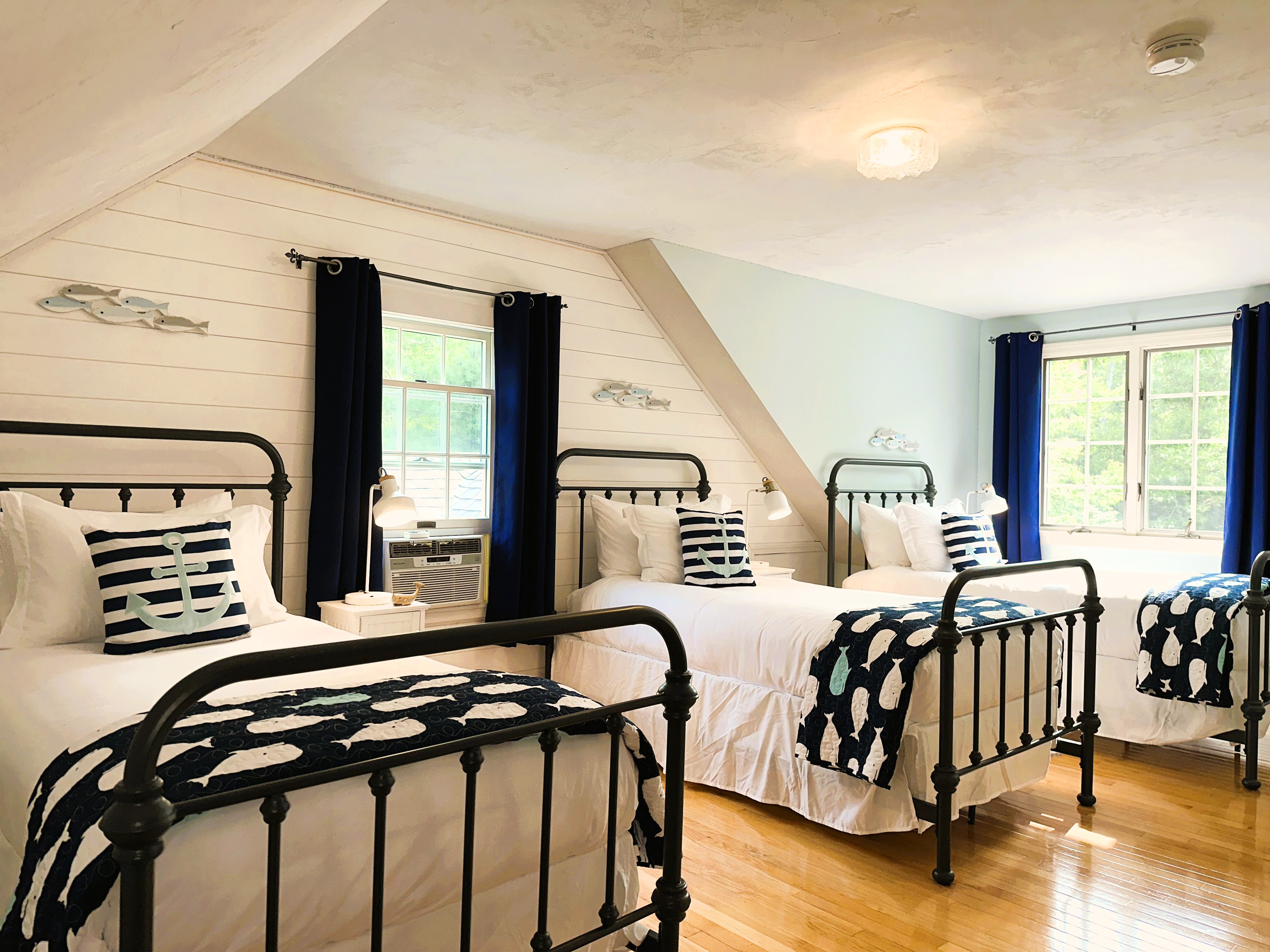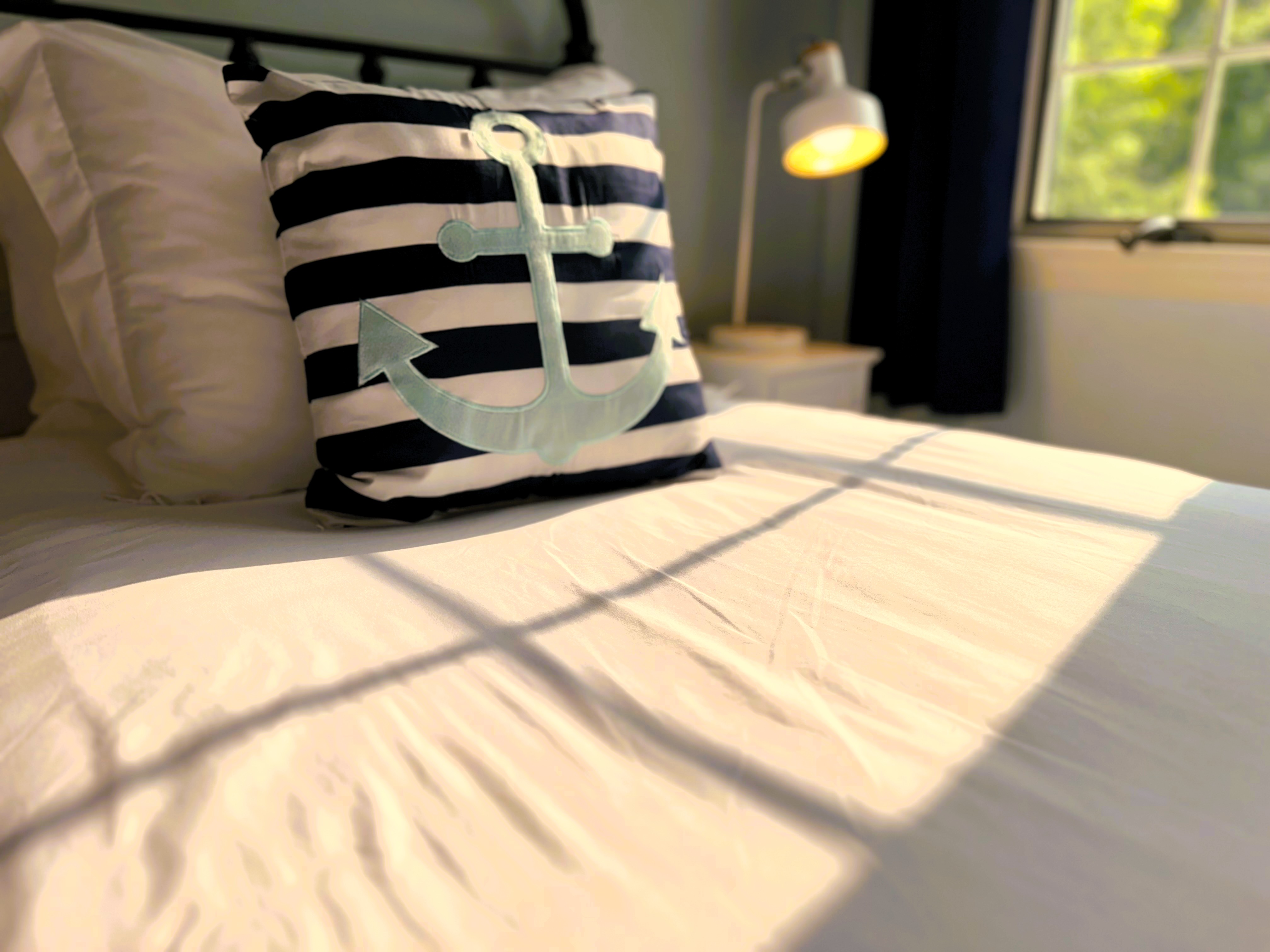 Inside, sunlight filters through open, coastal-inspired spaces that feel both relaxed and refined. The main level features a serene master suite connected to a cozy reading nook—perfect for slow mornings with a warm mug. Upstairs, you’ll find a queen bedroom with its own Roku TV for laid-back movie nights and a cheerful twin room ideal for the younger crew.