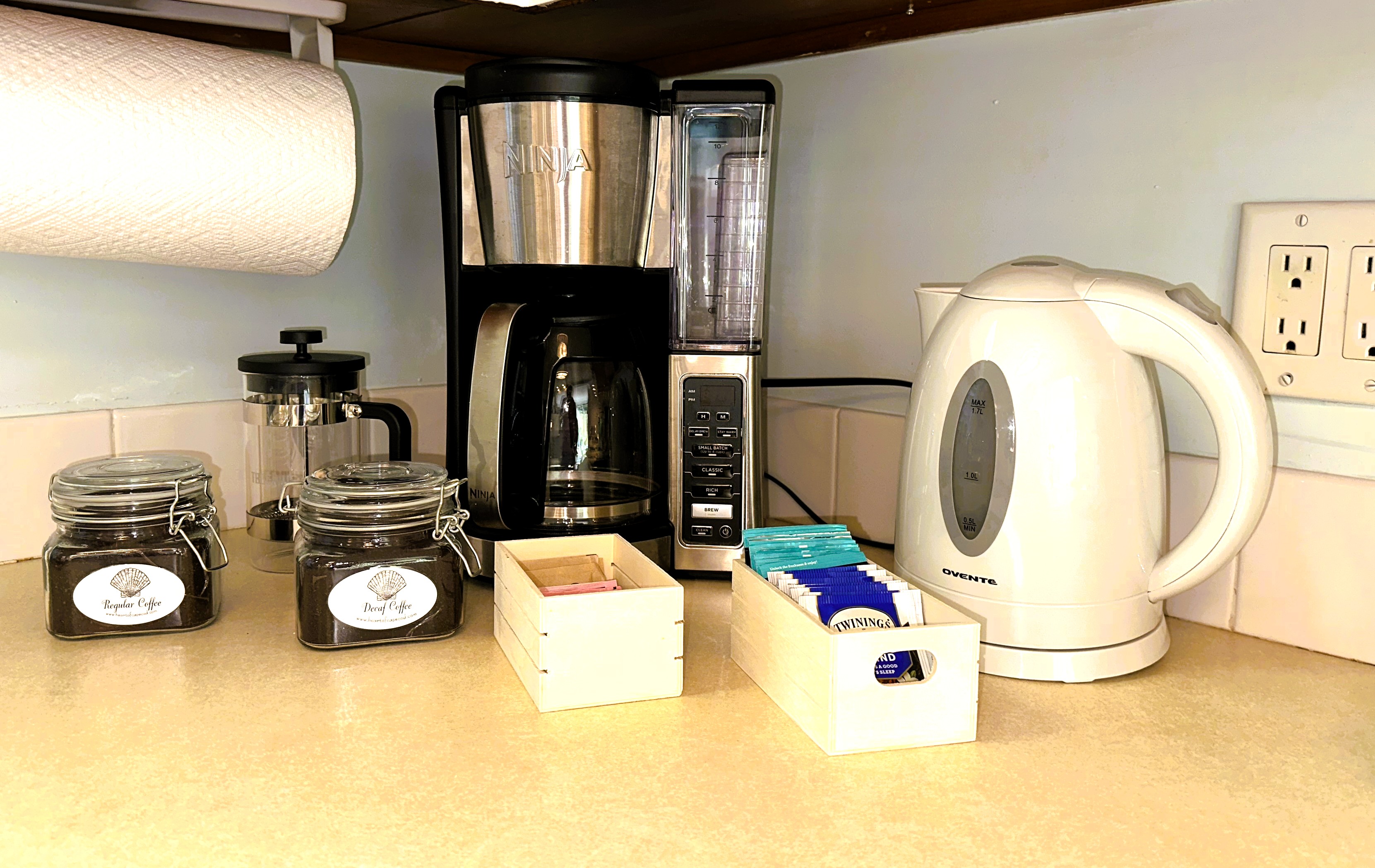 • Coffee bar with drip coffee maker, French press, hot water kettle, and assorted teas (regular & decaf)