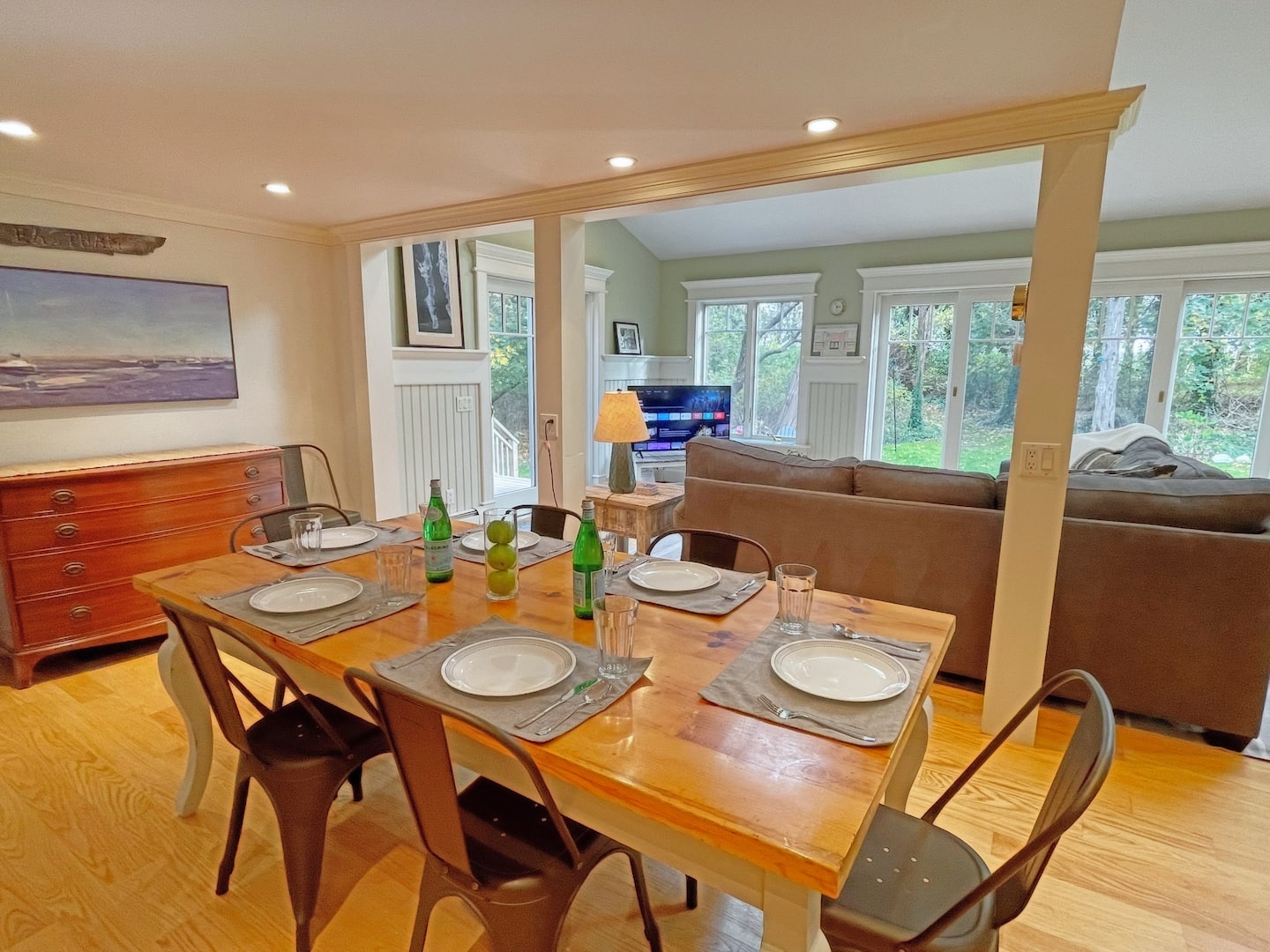 Inside, you’ll find an open floor plan filled with natural light from walls of windows, skylights, and sliding glass doors. The cozy sectional invites you to gather for movie nights, while the large dining area is perfect for family meals or a classic Cape Cod lobster feast. A fully stocked kitchen, complete with a coffee bar, makes mornings easy and enjoyable.