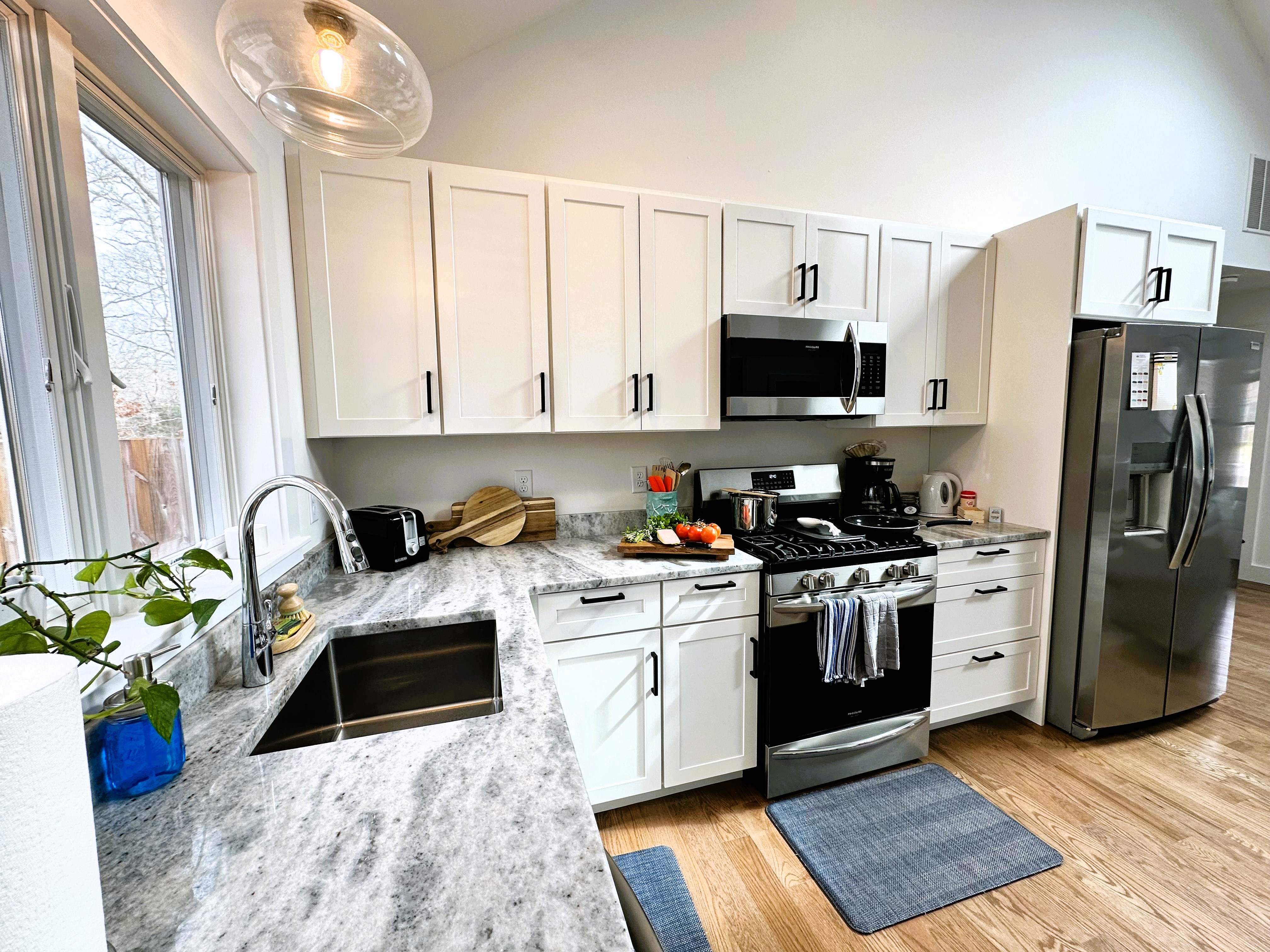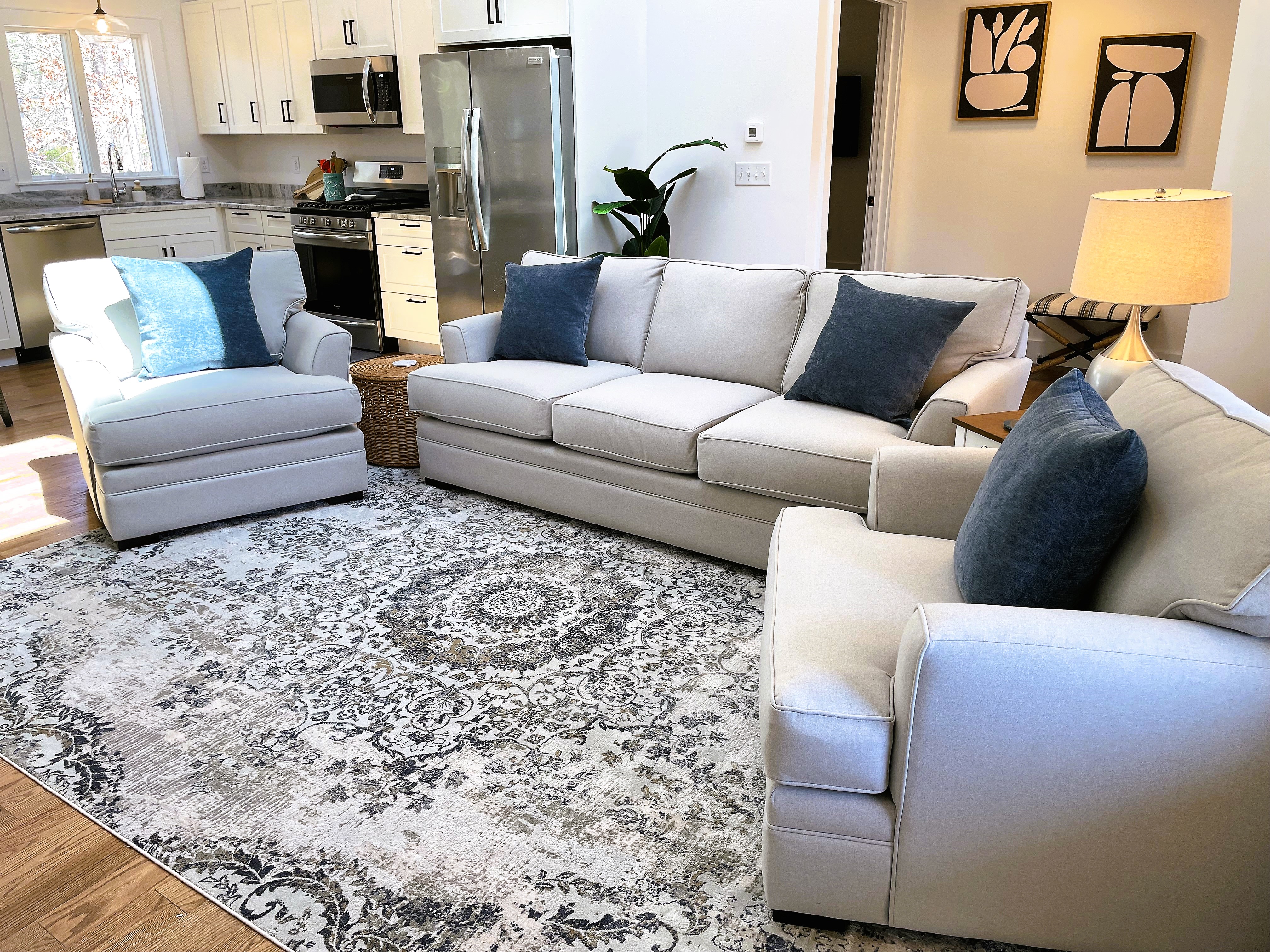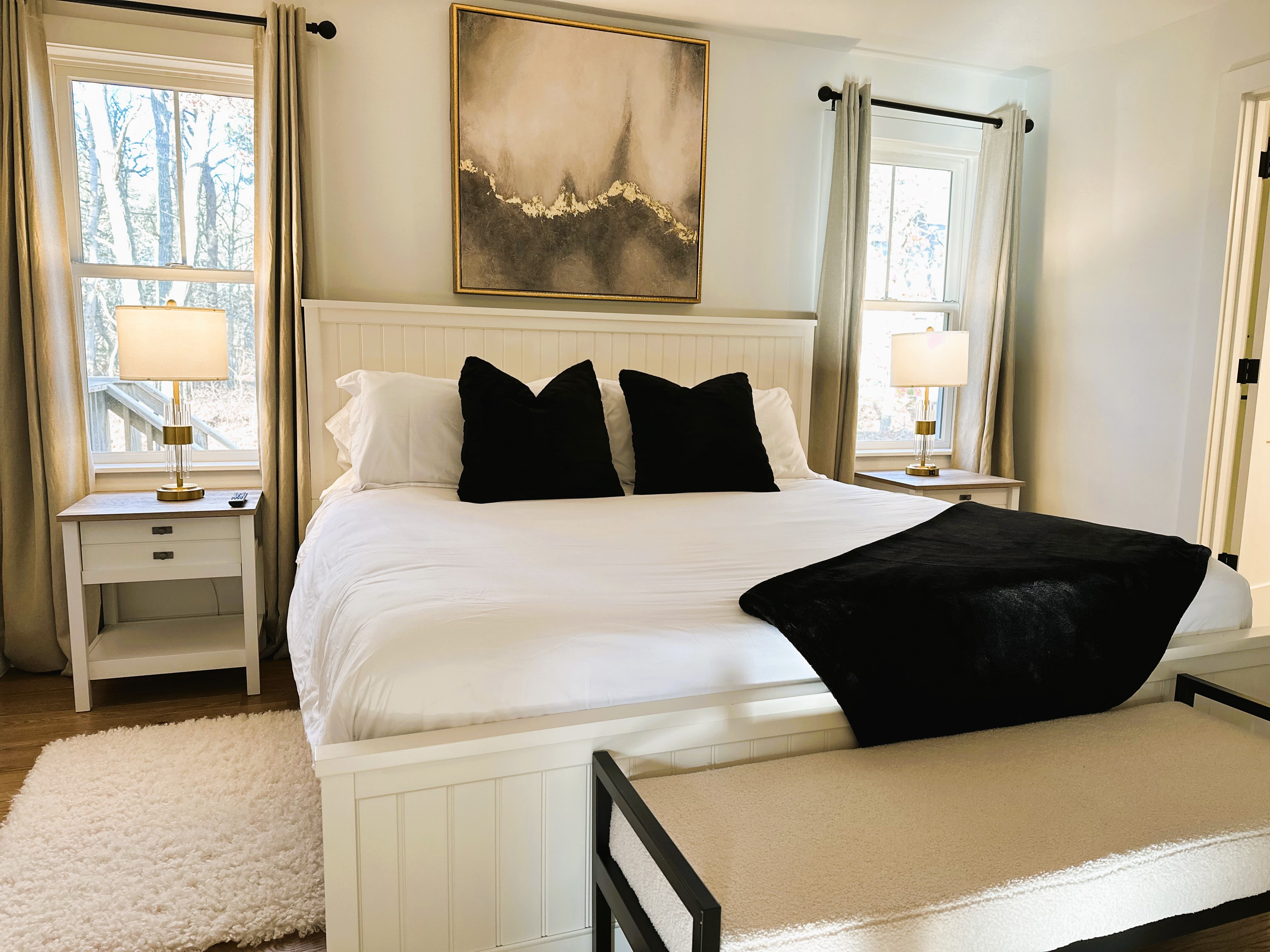 A few little things we missed in the kitchen: toaster tongs, a grater, and a pie server. The master bathroom was missing a bath mat. The fuzzy white throw rugs in the master bedroom are actually quite slippery (they do not slide on the floor, but a person could easily slide on top of the rugs and fall).