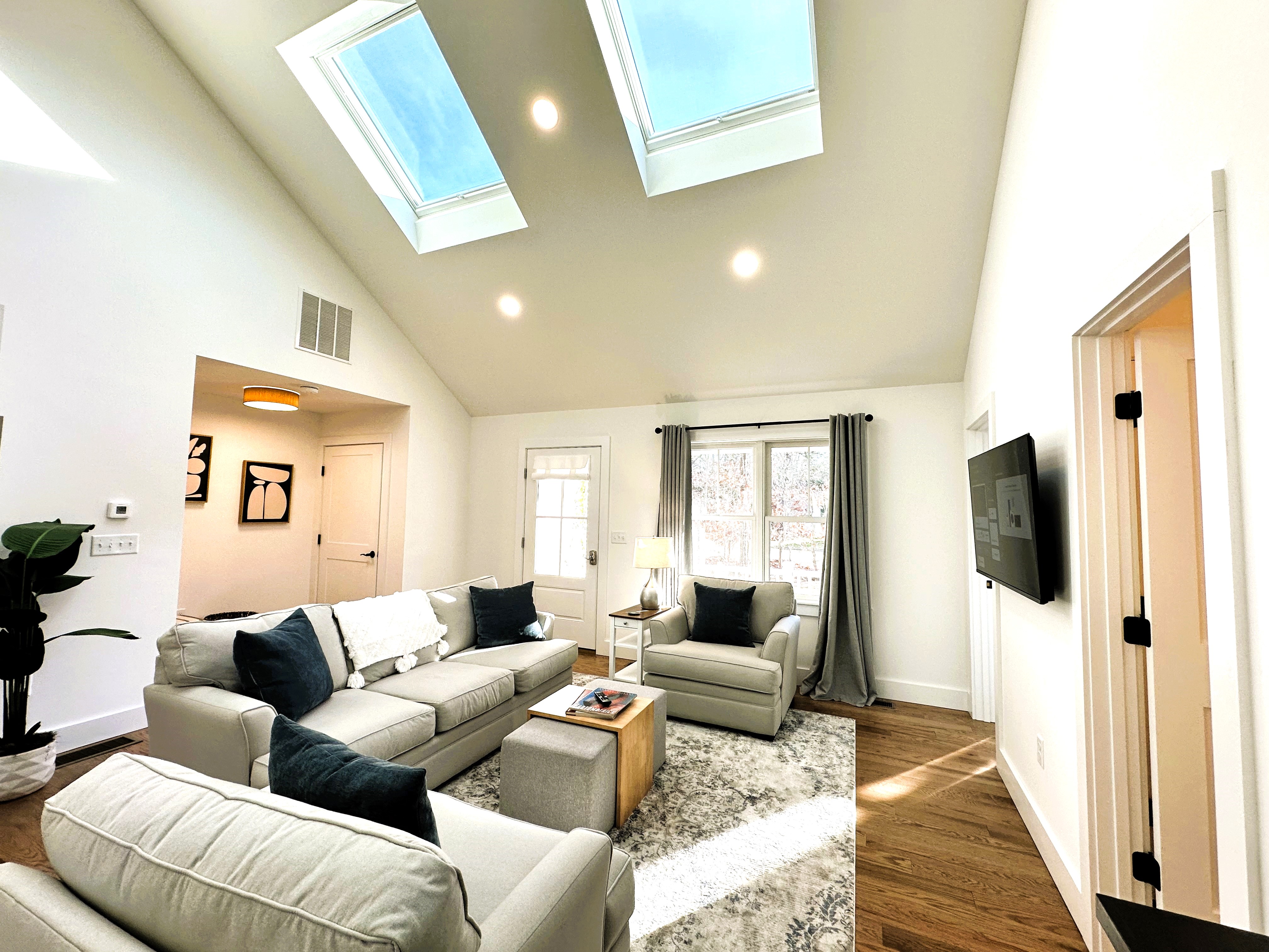 For moments of peace and reflection, slip into the cozy “Zen Den,” a serene space perfect for meditation, reading, or simply relaxing. The open-concept main living area, with its skylights and high ceilings, brings in plenty of natural light, making it a warm and inviting place to gather. The large dining area flows into the modern kitchen, keeping everyone connected as you prepare a hearty fall meal.