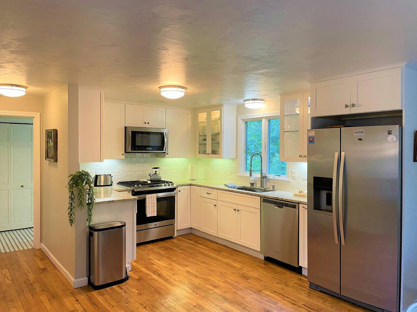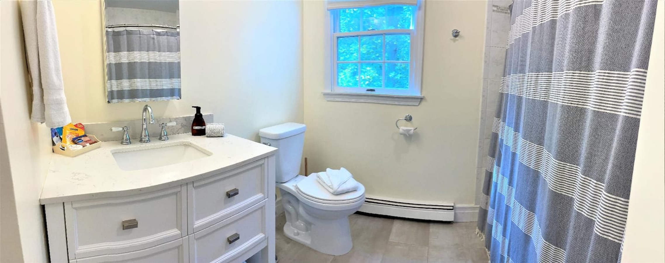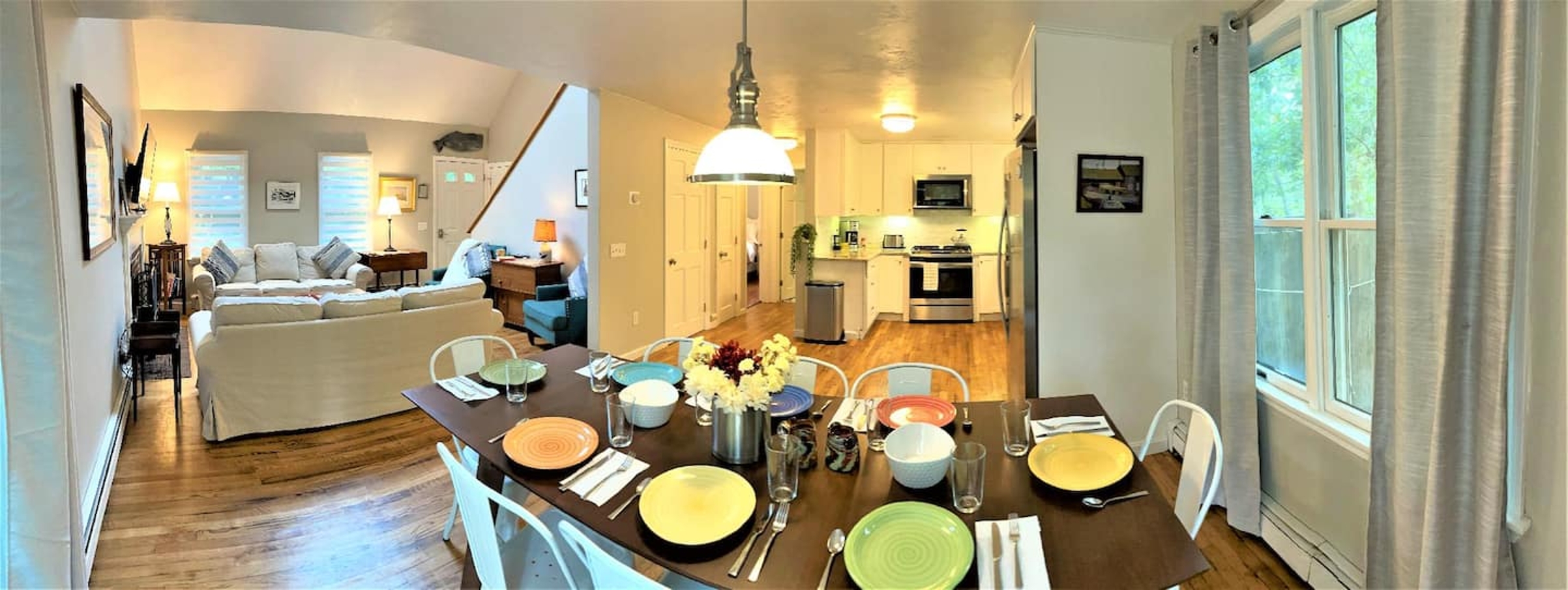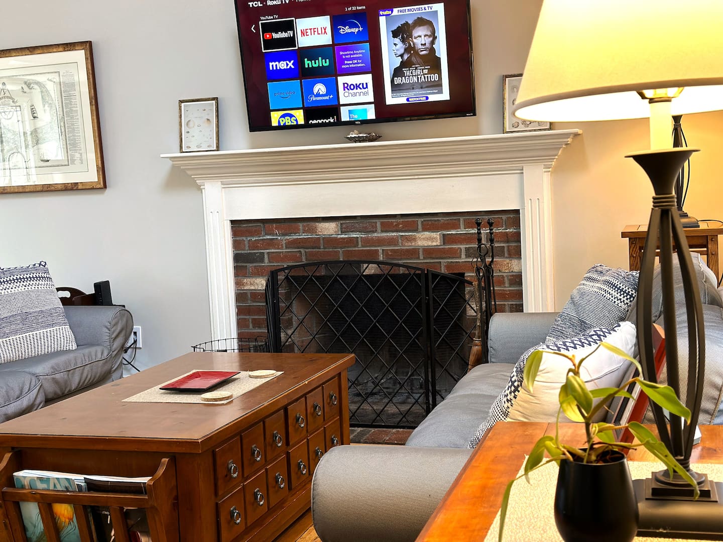 Our updated, three-bedroom home is a cozy autumn escape, with two large bedrooms upstairs and one downstairs. Two full baths—including one with a deep soaking tub—make it easy to unwind after a day of adventure. The spacious, open kitchen is ideal for preparing hearty fall meals, with updated appliances perfect for anything from a Thanksgiving feast to simple apple pie. Warm up by the fireplace and watch your favorite fall films on the large Roku TV, with cozy throw blankets available for snuggling.