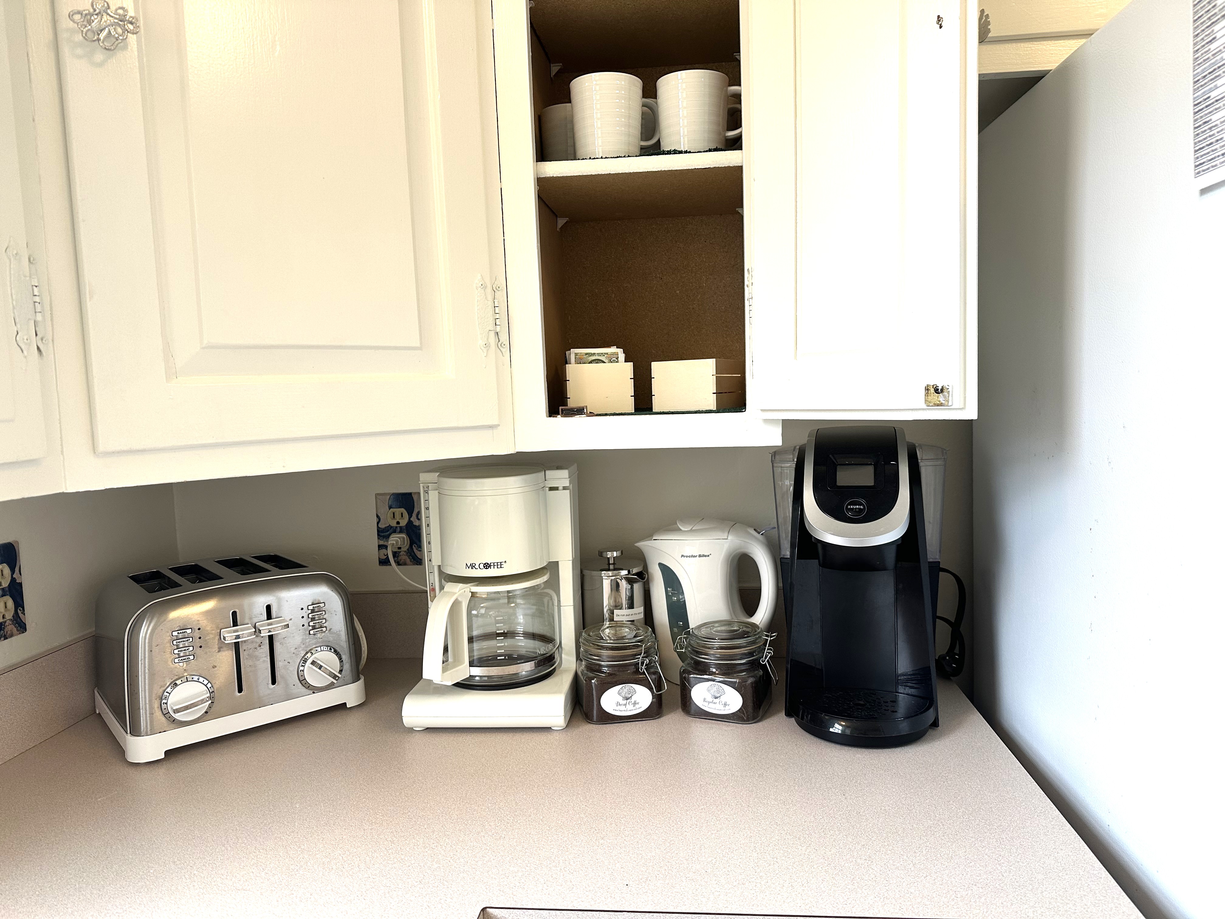 • Curated coffee bar with drip coffee, Keurig machine (pods not provided), tea, and both regular and decaf coffee